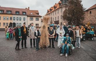 Im Strohkleid steckte in diesem Jahr Franz Eberitzsch aus Freienorla, begleitet von seinen zwei Bärenführern und seinem Gefolge mit Brautpaar und Baby. Weitere Schülerinnen sammelten Geld und Süßigkeiten.