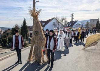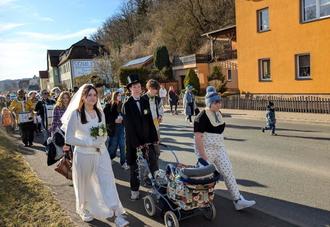 Am Fastnachtsdienstag wurde dann ab 12:00 Uhr der Strohbär von Mario Gäbler angekleidet. Pünktlich 13:45 Uhr setzte sich der bunte Zug in Bewegung. Auf dem Markt wurde erstmals Halt gemacht, der Strohbär tanzte und stellte sich den vielen Schaulustigen und Fotografen. Immer mehr Menschen schlossen sich dem Zug an. Dann ging es weiter durch Burgstraße, über Stadtberg und Mühlberg entlang der Rudolstädter Straße. Auf dem Mittelkreis angekommen, wurden die Umzugsteilnehmer von vielen Gästen begrüßt. Nach einem längeren Aufenthalt ging es dann weiter zur Siedlung, wo der Strohbär von seiner Hülle befreit wurde. Diese ging dann sehr schnell in Flammen auf und symbolisierte die Austreibung des Winters.