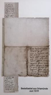 Das erste Dokument ist ein Bestellzettel, geschrieben in Orlamünde im Juni 1519. Wie wir heute wissen, wurde Thomas Müntzer im Mai 1519 von Karlstadt (Andreas Rudolff Bodenstein 1486-1541 und einst Pfarrer in Orlamünde) nach Orlamünde geschickt. Hier betrieb Müntzer Literaturstudium. Aus dem Inhalt entnommen ging es um Karlstadts Weingarten, der bestellt ist, der Zins bezahlt, und wenn er beabsichtige zu verkaufen, er versucht einen Käufer zu finden der bereit ist 12 alte Schock zu bezahlen. Es wurde auch Geld vom Weinberg gebracht und es kam auch Geld durch den Weinverkauf. Die eigentliche Bestellung zur Leipziger Messe sind 2 Sägen, 1 Hacke, 1 Eber, für den Schulmeister 1 Lot Safran und Schrauben, verschiedene Kräutersamen und Bücher. Termin der Zahlung, entweder zu Petri und Paulus (Ende Juni) oder zur Leipziger Messe nach Futtern (kulinarisches großes Essen zum Ende des Markttreibens).