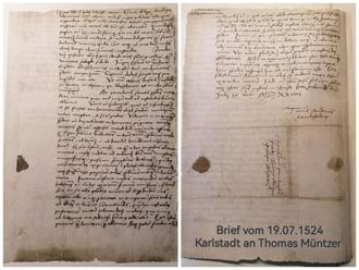 Mit dem Brief vom 19.07.1524 aus Orlamünde, der wissenschaftlich durch Frau S. Fraedrich-Nowag behandelt wurde und der sich im Original in der Rossijskaja Gosudarstvennaja Biblioteka (russische Staatsbibliothek) in Moskau befindet, antwortete Karlstadt auf ein heute verschollenes Schreiben Müntzers, der ihn eventuell darin aufgefordert hatte für ein christliches Bündnis (Allstedter Bund) zu werben, wo Karlstadt anschließend den benachbarten Pleban (Pfarrer) in Heilingen, Bonifatius von Roda (um 1480-1560) um Rat gefragt hatte.