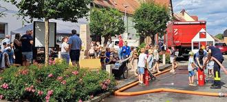 Danach und auch schon während der Kaffeemusik kamen die Kleinsten auf ihre Kosten. Doris Schreier hat sich wieder Wasserspiele für die Kinder ausgedacht und sie mit den abwechslungsreichsten Spielen beschäftigt. Auch die FFW Olamünde ließ es sich nicht nehmen, die Kinder für die Feuerwehr und das „Löschen von Feuern in einem Haus“ zu begeistern. Wer wollte, konnte den Schlauch in die Hand nehmen und ein fiktives Feuer in einer Hausfassade löschen. Der Spaß war den Kleinen anzusehen. Aber auch das große Feuerwehrauto konnte inspiziert werden. Welches Kind darf so etwas schon? Danke an alle Beteiligten.