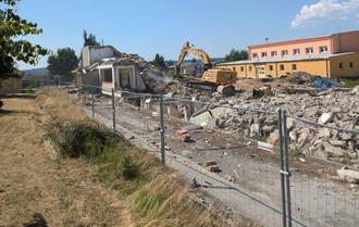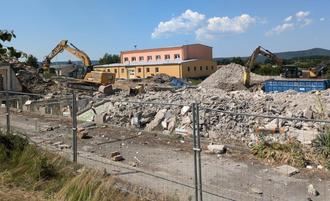 Die Abrissarbeiten gehen zügig voran. Das geschredderte Material wird wieder an Ort und Stelle eingebaut. Somit erhalten wir zwischen Buswendeschleife und dem Eingang zum Neubau der Grundschule eine Ebene.