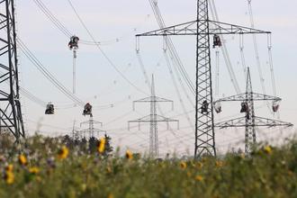 In luftiger Höhe montieren die Arbeiter von in den Leitungen eingehängten Wagen aus die Abstandshalter für die in Viererbündeln angeordneten Leiterseile. Foto © 50Hertz