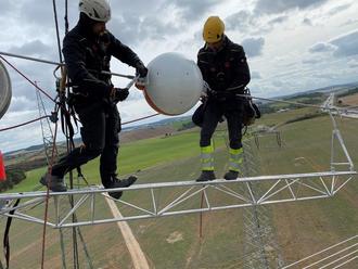 Arbeiter montieren die Flugwarnkugeln über der A9 zwischen Pörmitz und Neundorf. Sie sorgen für eine bessere Sichtbarkeit der Leitung, um Rettungshubschrauber bei einem notwendigen Einsatz auf der Autobahn zu warnen. Foto © 50Hertz