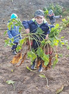 Was war das für ein lustiges Gewusel auf dem Acker. Emsig füllten die Kinder Korb um Korb mit den Knollen. Als Lohn für die Arbeit erhielten wir eine große Box voller Kartoffeln. Aus denen backten wir schon zwei Kartoffelkuchen für die Kinder. Die restlichen Kartoffeln verarbeiten wir zur Kartoffel - und zur Kürbissuppen, die es, an Stelle der üblichen Rostbratwürste, nach dem Laternenumzug am 10.11. gegessen wurden. Die Kinder freuten sich sehr, als ihre selbst gebastelten Laternen in der Dunkelheit leuchteten.
