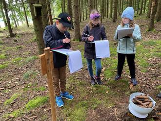 Die Schülerin Alina notierte später dazu: „Nach dem Frühstück teilten wir uns in Gruppen auf und der Förster zeigte uns, an welchen Stationen wir arbeiten sollten.“ Ausgerüstet mit Stift und Aufgabenbögen auf Klemmbrettern machten sich die Gruppen zügig an die Arbeit. Fabian berichtet hinterher: „Bei einer Aufgabe sammelten wir in nur 5 Minuten so viele Eicheln, wie wir konnten. In einer anderen ermittelten wir mit dem Bandmaß die Länge eines Baumstamms und rechneten das Ergebnis in verschiedene Einheiten um“. Die Zahlen hörten sich schon recht ungewöhnlich an: der Baum war 12 Meter lang. „Das sind aber auch 1200 Zentimeter oder 12000 Millimeter.“