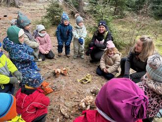 Ein großer Gewinn für uns ist, dass die Waldpädagogin Christina Weise vom Thüringen Forst mit uns die Natur entdeckt. Mit Jahreszeit spezifischen Angeboten begleitet sie uns beim Forschen, Entdecken und Erkunden unseres Kindergartenwaldes und der Natur. Durch liebevolle, themenbezogene und kindgerechte Ideen unterstützt sie die Kinder beim Lernen. Einmal in jeder Jahreszeit verzaubert uns Christina mit Spielen, Erkundungen und kleinen Waldaufträgen. So erleben und verstehen die Kinder den Jahreskreislauf unserer Natur. Bei unserem Wald Tag im November des vergangenen Jahres lernten die Kinder mit großem Interesse und Freude, wie die verschiedenen Tiere über den Winter kommen - Winterschlaf, Winterruhe, Winterstarre oder die Zugvögel die in den Süden fliegen und andere, die sich über das Futter im Vogelhäuschen freuen.