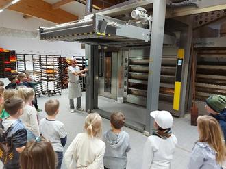 Im Anschluss folgte eine Führung durch die Bäckerei. Gerade wurden frische Stollen und Brötchen hergestellt, was den Raum mit einem angenehmen Duft erfüllte. Besonders fasziniert zeigten sich die Kinder von den großen Mehlbehältern sowie den Backöfen, in denen täglich zahlreiche Backwaren entstehen. Der Bäcker Herr Soffa erklärte kindgerecht die Arbeitsabläufe, stellte den Kindern kleine Aufgaben zum Überlegen und beantwortete viele neugierige Fragen.