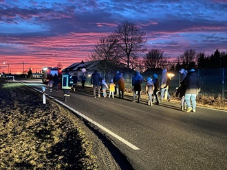 In der Zwischenzeit war es dunkel geworden und vor dem Stall wartete im Anschluss an die Besichtigung schon die Freiwillige Feuerwehr Oettersdorf, um die Wanderer mit Fackeln zurück zur Ortsmitte zu begleiten. Hell leuchtend und mit vielen neuen Eindrücken machten sich die Familien und LehrerInnen auf den Weg zurück zur Schule.