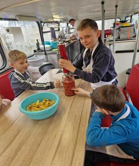 Sind die Kartoffeln aus der Erde, müssen sie natürlich weiterverarbeitet werden. Die vielfältigen Möglichkeiten wurden am 11.02.2025 in Verbindung mit einem Kartoffelbus direkt vor der Haustür der Schule in Oettersdorf gezeigt. Der Kartoffelbus wurde durch die Schule in Absprache mit der Oettersdorfer Landwirtschaftlichen AG organisiert und durch den Deutschen Kartoffelhandelsverband e.V. gesponsort. Im oberen Teil des Busses befindet sich eine Küche inklusive Schulungsraum, indem die verschiedenen Klassen die Kartoffeln im Laufe des Tages zu leckeren Speisen weiterverarbeiten durften. Hier allem voran bei den Kids die beliebten Pommes sowie eine Kartoffelsuppe mit Wiener Würstchen und Kartoffeln mit Quark. Dabei erklärte Michael Weise von der ESSEN WISSEN Stiftung Eildermann jeden einzelnen Schritt und die Kinder konnten mit großer Freude schälen, schneiden und natürlich auch zu guter Letzt das fertige Gericht verkosten.