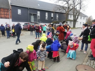 Als die Schulkinder die Kindergartenkinder abholten, wurden zuallererst die ausgefallenen Kostüme der jeweils anderen begutachtet und bewundert - darunter fielen natürlich auch die tollen Kostüme der Lehrerinnen und Erzieherinnen. Als beide Gruppen vereint waren, ging es auch schon los zur großen Dorfrunde. Dabei wurde nicht nur laut gesungen, sondern auch alle möglichen Krawallmacher wie Pfeifen und Trommeln genutzt, damit die Anwohner Moßbach´s auch ja nicht vergessen, sich an den Straßenrand zu stellen und den Kindern Süßigkeiten zuzuwerfen. Viele Anwohner standen bereits in Stellung - auch ganz ohne Krawall - um die Kinder mit Süßigkeiten zu beschenken. Sobald eine Handvoll Süßigkeiten in die Mitte der kostümierten Gruppe flog, stürzten sich die Kinder begierig auf die Süßigkeiten. Dabei hofften die Anwohner, dass sich die Kinder nicht die Köpfe aneinanderstoßen.