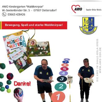 Unser Kooperationspartner LSV 49 Oettersdorf e.V. hat mit den Waldknirpsen das Muskelkater-Bewegungsabzeichen durchgeführt! Mit viel Freude wurde unter anderem geklettert, gesprungen und balanciert - denn Bewegung macht nicht nur stark, sondern auch richtig Spaß!