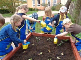 Im Anschluss wurde in einem Sitzkreis Kraft getankt sowie die verschiedenen Samenarten und Pflänzchen dem jeweiligen Gemüse zugeordnet. Nachdem dies geschehen war, fanden dann Spinat, Salat, Gurke und co. ihren Platz im neuen Beet und wurden mit den mitgebrachten Kindergießkannen angegossen. Zu Recht konnten die Kinder stolz auf sich sein. Zusätzlich durften wir uns über neue Bücher zum Thema „Gärtnern“ freuen.