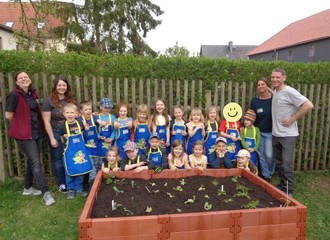 Am 09.04.2024 bekamen die Vorschüler des Oettersdorfer Kindergartens Besuch von drei Mitarbeitern von EDEKA. Im Gepäck hatten diese alles, was man zum Anlegen eines Hochbeetes benötigt. Nachdem die Vorgehensweise besprochen wurde, durften sich alle Kinder eine der mitgebrachten Schürzen umlegen. Gut vorbereitet konnten die kleinen Gärtner nun gemeinsam mit Unterstützung der Erwachsenen das Hochbeet aufbauen und befüllen.