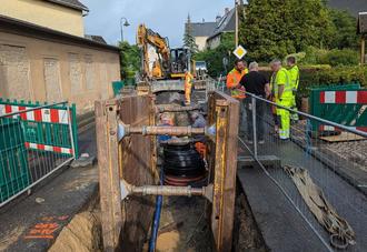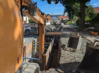 Trotz felsigem Untergrund gehen die Tiefbauarbeiten in der Ortsdurchfahrt von Moßbach planmäßig voran