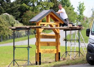 Holger Neudeck beim Montieren der neuen Begrüßungstafel in Chursdorf