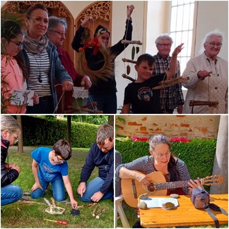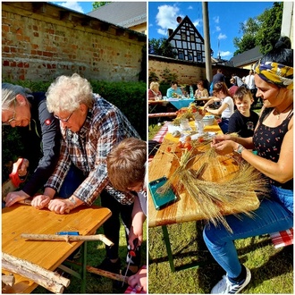 In unserer ersten Familienkirche beschäftigte uns das Element Erde, das wir uns mit allen Sinnen erschlossen haben: Das Riechen und Schmecken beim fröhlichen Kaffeetrinken, das Sehen und Hören beim Besuch der Baumgemeinschaft im Pfarrgarten; es fehlte also noch das Fühlen der Mitschöpfung rund um das Element Erde. Wir bastelten im Kirchgarten aus Ästen kleine Gehänge zum Dekorieren, Ährenkränze wurden gebunden und Naturmandalas gelegt… Alle Schätze der Erde, die die Schöpfung an diesem Nachmittag für uns bereithielt, wandelten wir in eigene kleine Kunstwerke um und präsentierten sie zur Abendandacht allen Teilnehmenden - ganz nach dem Motto: In der Familienkirche ist jeder in seinem Element, jeder bringt sich ein, jeder gestaltet mit und jeder bekam falls nötig Unterstützung und Hilfe.