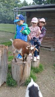 Anlässlich des Kindertages wollten wir unseren Kindergartenkindern natürlich etwas Besonderes bieten. Nach dem Frühstück ging es mit einem, nur für uns bestellten Reisebus nach Zeulenroda ins Tiergehege. Die Busfahrt war für die Kinder schon besonders, für Einige war es ihre erste Busfahrt. Dort angekommen, erwartete uns schon eine ehrenamtliche Mitarbeiterin des Tiergeheges Zeulenroda. Sie führte uns zu zwei Eseln, auf denen die Kinder reiten konnten. Die Freude war groß und wir bewegten uns in Richtung Ziegengehege, welches man begehen konnte. Mit mitgebrachten Möhrchen fütterten die Kinder die hungrigen Ziegen und Zicklein und die Kinder lachten und meckerten vor Freude, wie die Zicklein. Danach schauten wir noch an den anderen Gehegen der Tiere vorbei. Wir entdeckten Emus, Kängurus, Alpakas, Hängebauchschweine, Dammwild, Erdmännchen, verschiedene Vögel, Schildkröten, einen Uhu und ein Pfau, der ein Rad schlug. Die Kinder tobten nach unserem Rundgang n auf den Spielplatz ausgelassen herum und danach brachten uns zwei Muttis Hotdogs zum Mittagspicknick. Gut gesättigt und erschöpft vom ausgefüllten Vormittag fuhren wir dann zurück in den Kindergarten, wo die Kinder glücklich, zufrieden und müde in ihr Bettchen fielen.