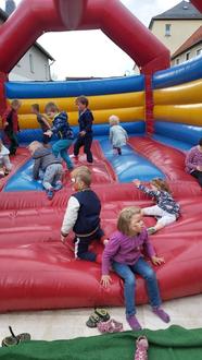Die Feuerwehrkameraden der FFW Tegau waren mit der Kübelspritze vor Ort. Auch auf der großen Hüpfburg war immer Betrieb. In den Verschnaufpausen ließen sich die Kinder schminken, bastelten Duftsäckchen oder spielten nach Herzenslust mit den Ankerbausteinen im Gruppenraum.
