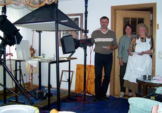 Für die Fotoaufnahmen wurde das Wohnzimmer der Dietzes zum Fotostudio. Hier im Bild Vertreter des Verlags und Gudrun Dietze bei Aufnahmen zum neuesten Buch im Jahre 2003