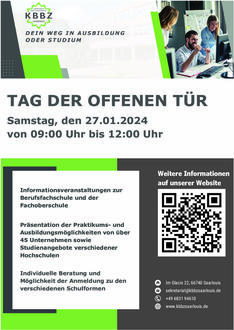 Am Samstag, dem 27.01.2024, findet am Kaufmännischen Berufsbildungszentrum Saarlouis der Tag der offenen Tür in Form einer Unternehmermesse statt. In der Zeit von 09:00 Uhr bis 12:00 Uhr stellen über 45 Unternehmen, Verwaltungen und Hochschulen ihre Praktikums-, Ausbildungs- und Studienmöglichkeiten vor. Darüber hinaus besteht die Möglichkeit, sich als Absolvent der Gemeinschaftsschule, zur Berufsfachschule für Wirtschaft und Verwaltung und zur Fachoberschule Wirtschaft und Verwaltung und anzumelden.