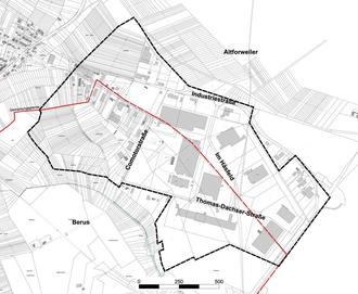 Geltungsbereich der Änderung der Bebauungspläne „Industrie- und Gewerbegebiet Häsfeld“ (1969) und „Gewerbegebiet Häsfeld“ (1971) sowie der Aufstellung eines Bebauungsplanes nach § 9 Abs. 2b BauGB in der Gemeinde Überherrn, Ortsteile Altforweiler und Berus: