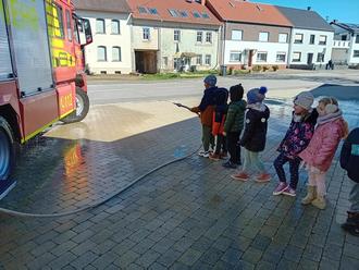 Die Rutschstange, welche die Feuerwehrmänner und Frauen benutzen, war ganz schön interessant und Markus führte uns sogar einmal vor, wie man an dieser runterrutscht. Ein besonderes Highlight war dann noch das "Spritzen mit dem Wasserschlauch". Wir durften alle einmal das große Feuerwehrauto mit dem Schlauch abspritzen. Das war ganz schön schmutzig. Die Fahrt mit dem Feuerwehrauto zu unsere Kita war dann der krönende Abschluss dieses interessanten Tages. Als Dankeschön überreichten wir Markus und Matthias ein selbstgemaltes Feuerwehrplakat". Wir werden diesen schönen Tag in Erinnerung behalten und freuen uns schon auf den Sommer, wenn uns die Feuerwehr besuchen kommt und für die wasserreiche Abkühlung sorgt.