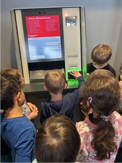 Ganz viele Sachen durften wir sogar selbst ausprobieren. An den Geldautomaten durften wir zuerst mit EC -Karte und dann mit Smartphone Geld abheben und einzahlen.