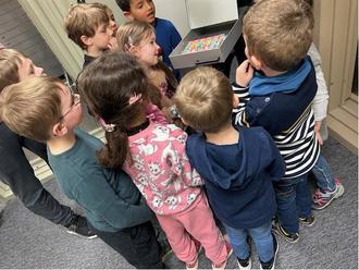 Wir haben Kontoauszüge gezogen und Geldscheine die wir am Anfang erklärt bekommen haben, durften wir in den Zählautomat stecken. Nachdem wir in den Schließfächern das Versteck vom Osterhasen entdeckt haben, gab es noch ein kleines Buffte mit Laugenteilen, Keksen und Getränken.