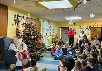 Jede Gruppe trug dem Nikolaus individuelle Lieder, Klanggeschichten oder Gedichte vor. Der Nikolaus hörte aufmerksam zu, bedankte sich für den schönen Besuch und schenkte jedem Kind einen Weckmann.