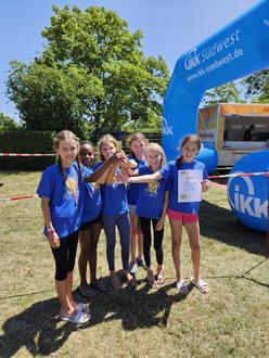 Am 24. Juni 2025 fand im Freibad im Blauloch in Wallerfangen die 20. Saarländische Schulmeisterschaft im Triathlon statt. Der Wettkampf wurde in allen Wettkampfklassen als "Swim & Run" durchgeführt. Für unsere Grundschule sind 6 Mädchen der 4. Klasse (Foto) gestartet. In ihrer Altersklasse mussten sie jeweils 100m schwimmen und 1.200m laufen. Unsere Schülerinnen sind in 2 Mannschaften gestartet und waren als Team besonders erfolgreich. In ihrer Altersklasse (Jahrgang 14/15) haben Sie den 1. Platz in der Mannschaftswertung belegt und den Pokal mit "nach Hause" genommen. Wir gratulieren herzlich!