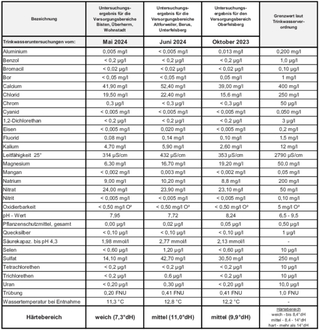 Trinkwasser ist unser wichtigstes Lebensmittel. Die Einhaltung der Bestimmungen und Richtwerte der Trinkwasserverordnung (TrinkwV) wird bei uns ständig vom Gesundheitsamt überwacht. Die Richtlinien für Trinkwasser sind bedeutend strenger als die Verordnung für Mineralwasser, Tafelwasser und Sprudel. Die Qualität des Trinkwassers in Deutschland ist absolut und auch im Vergleich mit den europäischen Nachbarländern hervorragend. So auch in unserer Gemeinde. Dies zeigen Ihnen z. B. die nachfolgenden Auszüge aus den Trinkwasseruntersuchungen:
