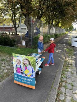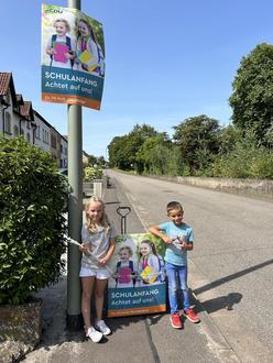 Um nochmals auf die besondere Verkehrssituation aufmerksam zu machen, haben wir daher am Wochenende Plakate aufgehängt. Dank meiner beiden fleißigen Helfer Damiano (1. Klasse) und Emma (3. Klasse), die mir in Vertretung aller Schülerinnen und Schüler zur Seite standen, waren wir auch richtig flott unterwegs.