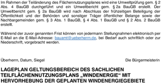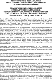 Gemäß § 2 Abs. 1 BauGB, in der Fassung der Bekanntmachung vom 03. November 2017 (BGBl. I S. 3634), unter Berücksichtigung der aktuell gültigen Änderungen, wird hiermit öffentlich bekannt gemacht, dass der Gemeinderat in öffentlicher Sitzung am 02.12.2025 den Beschluss zur Einleitung des Verfahrens zur Fortschreibung des sachlichen Teilflächennutzungsplanes "Windenergie" gefasst hat.