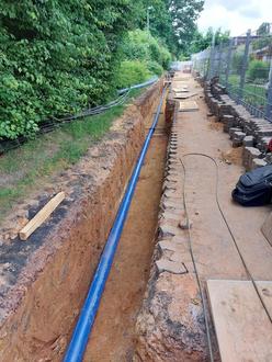 Im „Hans-Sachs-Weg“ wurde vom Garagenhof aus bis ca. Hausnummer 14 im Zuge einer Begleitmaßnahme mit der energis GmbH auf einer Länge von ca. 120 Metern eine neue Trinkwasserleitung verlegt und die beiden vorhandenen Hausanschlüsse erneuert sowie auf die neue Trinkwasserleitung angeschlossen.