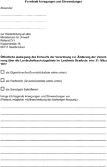 Jeder, dessen Belange durch das Vorhaben berührt werden, kann während der Auslegungsfrist bei der Gemeinde Überherrn Anregungen und/oder Einwendungen schriftlich oder zur Niederschrift vorbringen, möglichst unter Verwendung des dort vorgehaltenen Formblattes.
