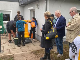 Bürgermeisterin Anne Yliniva-Hoffmann, Ortsvorsteher Günter Hild und Kreisbeigeordneter Dietmar Bonner ließen sich beim „Show-Pressen“ von den Schülern zeigen, wie Apfelsaft produziert wird.