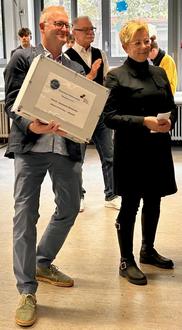 Bürgermeisterin Anne Yliniva-Hoffmann überreichte Schulleiter Christian Konrad einen Koffer mit deutsch-französischen Jugendbüchern