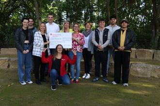 Stolz überreicht die Schülervertretung des KBBZ Saarlouis im Beisein von Frau Dr. Vanessa Wassong (Leiterin NBS), Herrn Dirk Bremer und Frau Sabine Peters-Klein (Schulleitung KBBZ Saarlouis), Frau Julia Kirchen und Frau Katja Kuhn (Kronkorkenprojekt) den Spendenscheck an Frau Vanessa Fritzen (Kinderhospizdienst)