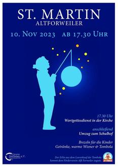 Wir laden alle um 17:30 Uhr zum Wort Gottesdienst in die St. Matthias Kirche nach Altforweiler ein. Nach dem Gottesdienst wird es wie gewohnt einen Umzug mit Laternen zum Schulhof geben. Dort warten neben dem Sankt Martins Feuer auch wieder Glühwein, kalte Getränke, Wiener und natürlich die Brezeln für die Kinder auf alle. Der Förderverein des Kindergartens wird auch dieses Jahr wieder eine große Tombola mit tollen Preisen organisieren.