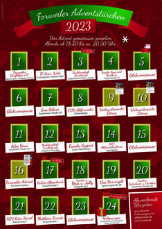 Herzliche Einladung zu den diesjährigen Forweiler Adventstürchen der Vereine, Nachbarschaften und Familien. Die ersten Türchen wurden bereits geöffnet und es waren schon ein paar schöne Stunden in netter Gesellschaft. Alle angebotenen Getränke und Snacks werden auf Spendenbasis angeboten. Nach Abzug der Unkosten des jeweiligen Ausrichters kommen alle Spenden der einzelnen Adventstürchen in einen großen Spendentopf. Die Spenden werden in diesem Jahr aufgeteilt unter folgenden Projekten: