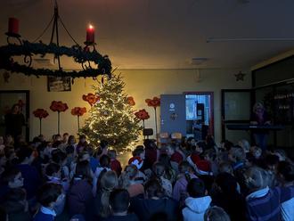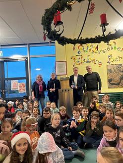Nachdem die Bürgermeisterin und die Geschäftsführung der KDÜ von allen Schülern im Foyer mit weihnachtlichen Liedern begrüßt wurden, erklärte Herr Krzizok die Verwendung des Trinkwasserspenders.