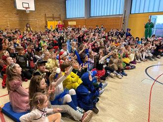 Den Schlusspunkt bildete die Feier mit allen gemeinsam in der Turnhalle. Das Programm wurde durch viele musikalische und kreative Beiträge bereichert. Über 60 Schülerinnen und Schüler präsentierten ihr Können auf der Flöte und erhielten dafür großen Applaus. Auch einzelne Klassen, der Schulchor und die Orff-AG begeisterten das Publikum mit fröhlichen Liedern, die gut zur närrischen Zeit passten.