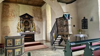 Blick auf den Altar und die Fresken der Steinbacher Kirche