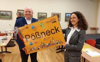 Nach mehr als 15 Jahren verlässt Dr. Julia Dünkel als Fachbereichsleiterin Finanzen/Kultur die Stadtverwaltung Pößneck. Bei der feierlichen Verabschiedung im Rahmen der Stadtratssitzung im Dezember 2022 überreichte Bürgermeister Michael Modde ihr ein Ortsschild als Erinnerung.