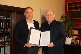Vor kurzem haben Lars Böhme, Gemeinschaftsvorsitzender der VG Oppurg, und Pößnecks Bürgermeister Michael Modde die gemeinsame Zweckvereinbarung zur Übertragung der standesamtlichen Aufgaben der VG Oppurg an die Stadt Pößneck erneuert. Nach mehr als 30 Jahren erfolgreicher Zusammenarbeit wurde diese Vereinbarung auf die geänderten rechtlichen Rahmenbedingungen angepasst.