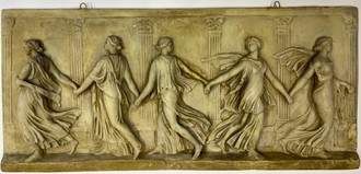 In der Sammlung des Museum642 befindet sich ein von Diez entworfenes großformatiges Relief, das einst für die Semperoper in Dresden geplant war, aber den Recherchen nach vor Ort offenbar nicht in die Gestaltung einbezogen wurde. Die Wahl des Motivs ist den schönen Künsten gewidmet: Fünf Frauen in antiken Gewändern sind zu einem Reigen im Tanz vereint, wobei die unterschiedlichen Laufrichtungen und fliegenden Gewänder sowie die diese beiden Paare in ihrer Körperhaltung verbindende Mittelfigur eine besondere Dynamik erzeugen. Bei dem Pößnecker Exemplar handelt es sich um eine recht genaue Kopie eines Reliefs, das sich unter dem Namen „borghesische Tänzerinnen“ heute im Pariser Louvre befindet und als Sarkophagrelief in die späthadrianische Zeit um 130/140 n. Chr. datiert werden kann. Solche antiken Reliefs wurden von Künstlern des frühen 20. Jh. häufig kopiert. Durch ein Verdoppeln der Gruppe beziehungsweise das Weglassen einer Figur der Figurengruppen wurde dabei bisweilen auch versucht, die Zahl der neun Musen zu erreichen. Neben Musen konnten derlei Figurenkonstellationen in der Antike wechselweise auch Tänzerinnen, Mänaden als Anhängerinnen des Dionysos oder mythische Gestalten verkörpern. Ob das Relief im Pößnecker Stadtmuseum ein Teilstück ist oder bewusst verkürzt dargestellt wurde, ist nicht verbürgt.