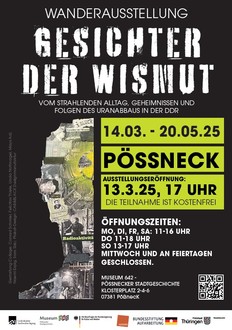 Wir freuen uns, die Ausstellung ab dem 14. März 2025 nun in Pößneck zeigen zu können. Thematisiert wird in vier Themenbereichen die Alltagsgeschichte des DDR-Uranabbaus in Ostthüringen samt seinen sozialen, kulturellen und politischen Dimensionen. Außerdem nimmt die Ausstellung die Transformationszeit seit 1989 und die gegenwärtige Erinnerungskultur in den Blick und fragt nicht umsonst: Was bleibt von der Wismut in der postindustriellen Gesellschaft übrig?