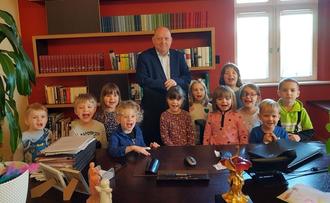 Am 21. März besuchten die Kinder der großen Gruppe vom Kindergarten „Am Sonnenhügel“ gemeinsam mit ihren Erzieherinnen Bürgermeister Michael Modde in seinem Büro im Rathaus. Sie hatten einige Fragen mitgebracht und wollten beispielsweise wissen, welche Lieblingszahl der Bürgermeister hat und warum es in Pößneck so wenige Radwege gibt.