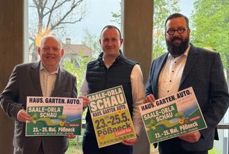Bürgermeister Michael Modde, Landrat Christian Herrgott und Robert Ninnemann vom Messeveranstalter Ram Regio Erfurt (v.l.) laden zur Saale-Orla Schau ein.